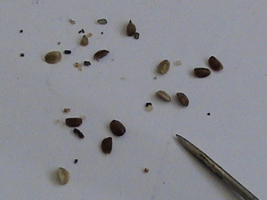 บางเมล็ดก็เล็กมาก อาจใหญ่กว่าปลายเข็มกลัดเล็กน้อยเท่านั้น(ในภาพเป็นเมล็ดลาเวนเดอร์สีฟ้าเทียบกับปลายเข็มกลัด) บางทีเมล็ดอาจร่วงออกมาจากดอกอยู่ที่ก้นซองแล้วนะคะ