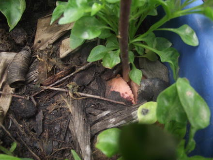 อยู่มาวันนึงช่วงเดือน มีนาคม สงสัยต้นอะไรมางอกอยู่ในกระถาง วอเตอร์เครส พอดีมาหาเด็ดยอดวอเตอร์เครส จะไปผัดไฟแดงกับเห็ด เจ้นันท์ ทีแรกมือคันนึกจะถอนทิ้ง เลยคิดอีกทีขุดลงไปดูดีกว่ามามันลูกอะไร อย่างน้อยต้องมีเปลือกของเมล็ดติดอยู่บ้าง พอแหวกพุ่มวอเตอร์เครสออก จำได้แล้ว...!!!!!