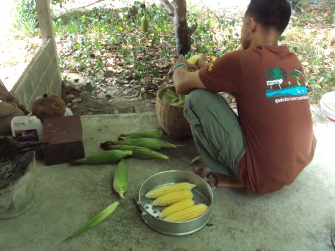 บ่ายโมงแดงกับอ้ายเวทย์ รีบมาสวน ป้าเล็กโทรมาบอกว่าอีก 32 กม. จะถึงสวนแดงแล้ว เลยให้อ้ายเวทย์รีบเก็บข้าวโพดสด ๆนึ่งไว้รอ