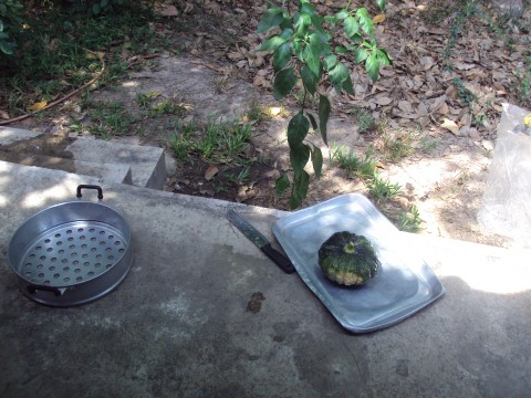 ฟักทองในสวน อ้ายเวทย์เก็บมาเตรียมนึ่งคลุกมะพร้าว