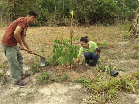 ป้าเล็กปลูกต้นฝาง ปลูกฝากกับต้นมะกอกป่า อยู่กับพี่มะกอกป่า น้องฝางจะได้โตเร็ว ๆ