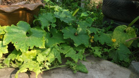 ต้นฟักเขียวท่ีซ่อนอยู่ใต้กระถางชวนชม