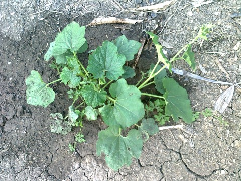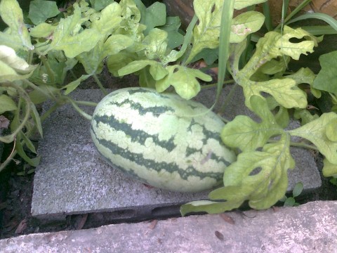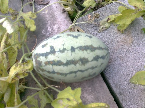 แตงโมที่ขึ้นเองติดลูกมาสองลูก คราวนี้ลูกโตกว่าคราวที่แล้วนิดเดียว กินได้ไม่เกินห้าคำก็หมดลูก