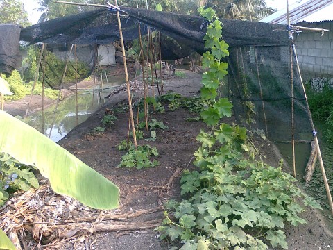 ลองมองอีกด้านนึง...ต้นฟักหอมเลี้อยขึ้นไปซะแล้ว ข้างในนี้มีอะไรวุ่นวายไปหมด ทั้งมะเขือ บวบหอม บวบเหลี่ยม ถั่วพร้า หน่อไม้ฝรั่ง แครอท ดอกไม้ ผักปลัง น้ำเต้า พื้นที่นิดเดียว ปลูกอย่างกับที่เป็นสิบไร่
