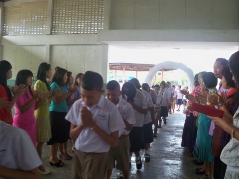 เด็กๆเดินแถวเข้าบริเวณพิธี มีรุ่นน้องและคณะครูคอยปรบมือต้อนรับ