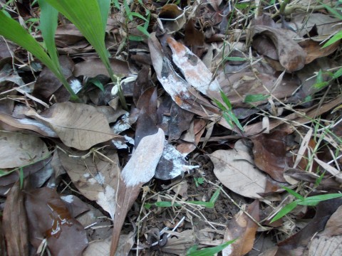 ที่เห็นขาวๆ บนใบไม้ คือเส้นใยของเชื้อรา