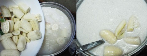 เมื่อกระทิเดือดแตกมัน ใส่กล้วยที่เตรียมไว้เลย บางคนเอาไปแช่อะไรก่อนรึเปล่าไม่ทราบค่ะ