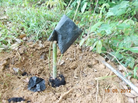 ก่อนปลูกเอามีดเฉือนก้นถุงให้ขาด แล้ววางลงในหลุม