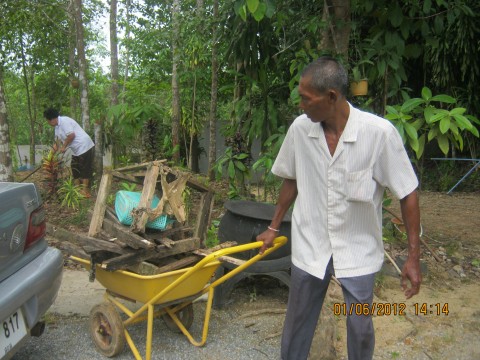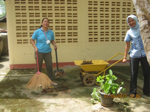 กิจกรรมวันนี้ น้องย๊ะ (คนคลุมผ้า)เป็นคนชวน เนื่องจากน้องรับผิดชอบโครงการวัดมัสยิดส่งเสริมสุขภาพ เวลาพัฒนามัสยิดน้อยก็ไปช่วยเสมอ วันนี้น้องย๊ะก็มาช่วยกันขยันขันแข็ง มีพี่อ้วนพี่ทำทำงานอีกคน ไปช่วยกันวันนี้ พวกเราไปนอกรอบ คือไปสำรวจว่ามีสิ่งใดขาดเหลือเพื่อจัดซื้อถวาย ไหน ๆก็ไปกันแล้ว อสม.ก้มาช่วยกันท่าน เลยลงมือกันกวาดใบไม้ซะก่อนเลย