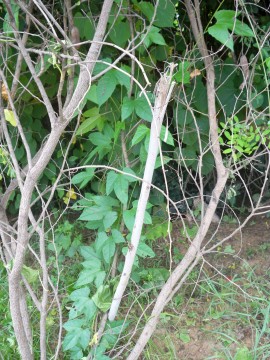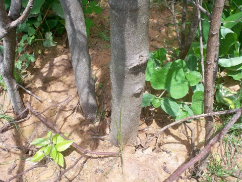 ตอไม้วางตั้งๆไว้รอกระถางดอกไม้มาประดับ ด้านหลังคือไม้ผลที่ลงไว้ตั้งแต่แรก