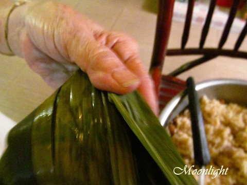 พับใบไผ่ลงมาปิดหน้าข้าวเหนียว แล้วค่อยๆ หักมุมพับออกจากตัวผู้ห่อ จะได้เป็นรูปสามเหลื่ยม