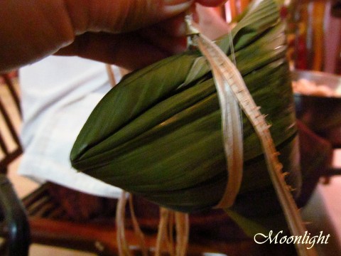 โดยทั่วไป เขาจะใช้เชือกฟางมัดเพราะสะดวก แต่เพื่อให้เข้ากับใบไผ่ เราจึงเลือกใช้เชือกกล้วย