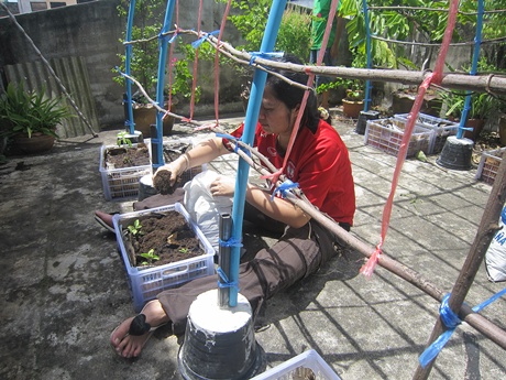 ส่วนป้าลัดจัดการหล่อปูนลงกระถางต้นไม้ 10 กระถางเพื่อใช้เป็นฐานผูกติดกับแป๊ปน้ำ เพราะถาดฟ้าเป็นพื้นปูน ป้าลัดหลอมมาจากที่บ้านแล้วใส่รถมา