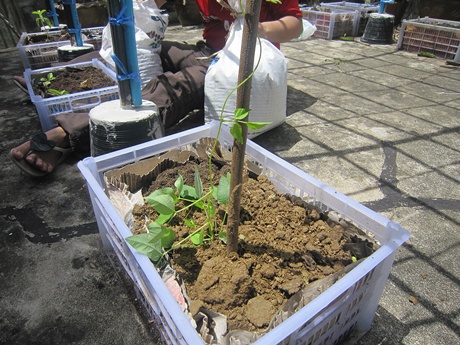 ภาพข้างบนเป็นต้นถั่วที่ป้าลัดกับพี่สมจิตขนมาให้ปลูก เพราะเรายังไม่มีไม้เลื้อยที่โตพอจะเลื้อยได้เลย เห็นสีน้ำตาลนั้นมั้ยคะ เป็นขี้วัวแห้งค่ะ โรยลงบนดิน ป้าลัดเอามา 2 ถุงจากพัทยาเลย และเป็นครั้งแรกที่นุสิ จับขี้วัวแห้งด้วย กลิ่นก็โอเคนะ ไม่เหม็น