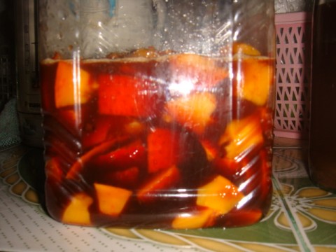 อันนี้..พูคาวหรือคาวตอง...อาจารย์ป้าข้างบ้านหมัก..เรา..ขอ...เอามาไว้เป็นสมบัติ..ไม่ได้กินหรอก เขาหมักเดือน มกราคม 55 หอมค่ะ ใบสด ๆ คาวมาก พอหมักกลับหอม ไม่เคยดูเลย ตั้งไว้ในตู้ วันนี้ไปหยิบมา อ้าว!..เป็นวุ้นหลายชั้นด้วย เป็นที่ผิวหน้า แล้วจมลง ก้นขวด แล้วก็เป็นชั้นใหม่ แล้วจม มีหลายชั้นค่ะ สีใสกว่านี้ แต่ไปหยิบมาไม่ระวัง เพราะไม่คิดว่าจะถ่ายรูป เห็นวุ้นก็เลยถ่ายซะ..