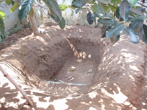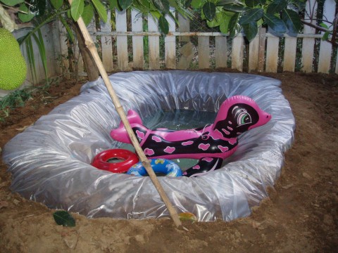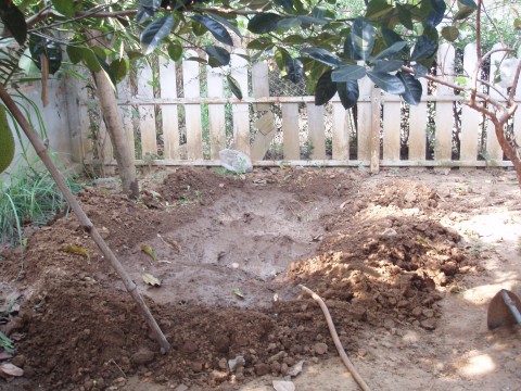 การขุดนั้นไม่ยากเท่าไรค่ะ ทำให้เป็นหลุมเล็กน้อย ต่อไปก็ใส่นำ้แช่ไว้ ให้ดินนิ่มแล้วค่อยเอาพลั่วตักออก บ่อนี้ขุดเองคนเดียว ใช้เวลา 2 วันค่ะ แบบทำๆ หยุด ๆ