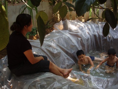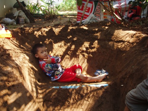 ขุดไปเจอท่อประปาไปหมู่บ้านที่อยู่ด้านหลัง ก็เลยทำเป็น 2 ระดับซะเลย บอกลูกชายว่าเาไว้ให้ปลาดุกมาพักผ่อน ที่เห็นแอ็คท่านี่ไม่ได้ช่วยอะไรหรอกค่ะ แค่ช่วยทำให้ยุ่งมากขึ้นเท่านั้นแหละ ( หลุดมาจาการควบคุมของคุณพ่อ)