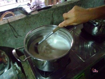 เอากะทิตั้งไฟแล้วใส่ผงวุ้น คนให้เข้ากัน