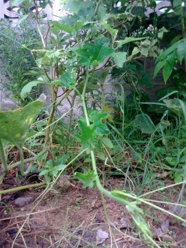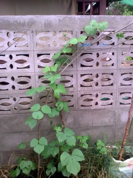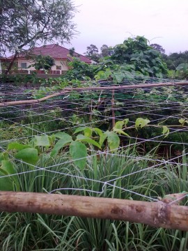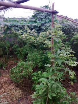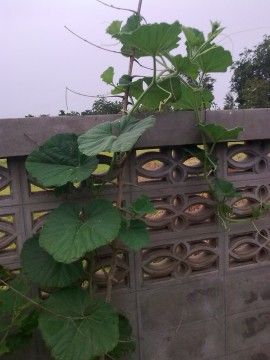 ค้างฟักข้าวด้านหลังเป็นถั่วครกด้านล่างเป็นโหระพากับมะเขือพวง