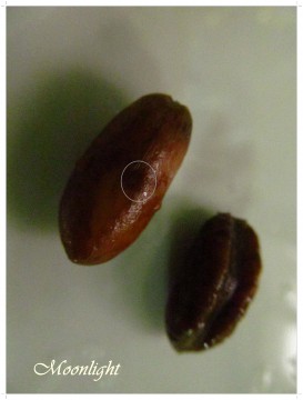ประมาณ ๕วันรากสีขาวจะงอกออกมาจากวงกลมเล็กๆ ด้านบน ถ้าอากาศไม่ร้อน จะใช้เวลานานมากในการงอก ระหว่างนั้น ต้องคอยพรมน้ำให้เมล็ดเปียก อย่าปล่อยให้แห้งเกิน หรือแฉะเกินไป เพราะจะทำให้รากเน่า