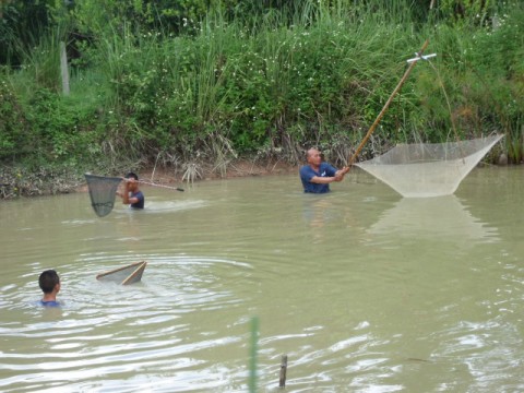 โดยมีลูกชาย(คนกลาง)กับหลาน คอยไล่ปลาให้เข้ายอด้วยความสนุกสนาน
