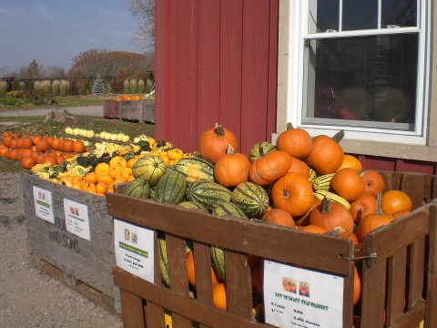 ผลิตผลที่วางขายนอกร้านมีฟักทองแบบต่างๆ