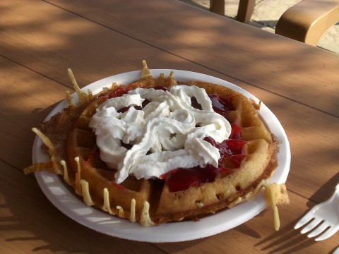 จานนี้ของอ้อยหวานค่ะ เวเฟอร์ทำสดๆร้อนๆราดหน้าด้วยแยมสตอร์เบอรี่และครีม