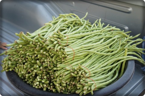 ถั่วฝักยาวที่เจ้าของสวนทิ้งแล้ว เพราะต้นเริ่มแก่ จะปลูกใหม่ อยากได้มาฝากเพื่อนและญาติ เก็บได้ 2 กาละมัง ยังเหลืออีกตั้งเยอะ