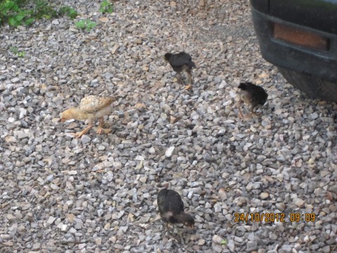 เเม่ไก่กับลูกไก่ทั้ง 4 ตัว