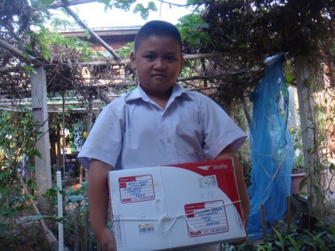 น้องโต๋กลับจากโรงเรียนพอดี เอากล่องเข้ามาให้แม่ในสวน