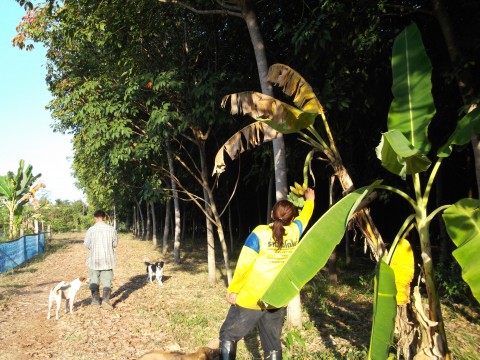 สายหน่อยแม่น้องอาร์มสวนติดกัน ได้ยินเสียงลูกหมูร้อง เลยแวะมาดู เดินผ่านกล้วย บอกขอกินหน่อยนะ อยากทำสวนแบบนี้บ้าง สวนตัวเองมีแต่ต้นยาง ไม่มีอะไรกินเลย ซื้อกินทุกอย่าง