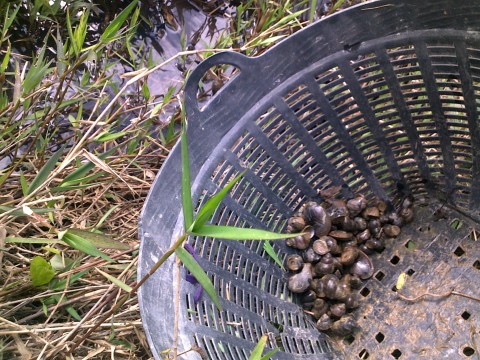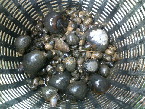 วันเสาร์ที่ผ่านมาอยู่เวรเลยได้หาข้อมูลเกี่ยวกับการเพาะเลี้ยงหอยขม ไม่ใช่เรื่องยากเลย ลงทุนก็น้อยมาก และไม่ต้องใช้เวลาอะไรมากมาย วันอาทิตย์ตอนเช้าในเหมือง ข้างบ้านหลังน้อยในสวน ตอนนี้น้ำเริ่มแห้งและขาดตอนแล้ว แต่ตรงนี้ยังพอดีน้ำอยู่ เริ่มต้นจากตรงนี้ก่อน หอยขมและหอยโข่งคือเป้าหมาย พ่วงมาด้วยปูนา ทุกอย่างอยู่ร่วมกันได้