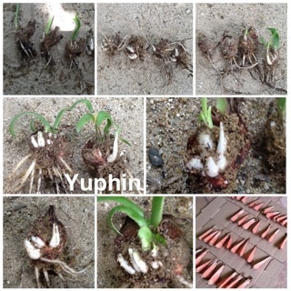 พี่เสินทำให้ออกดอก ส่วนน้องก็ฝึกวิทยายุทธ์อยู่ค่ะ ขยายพันธุ์เพิ่มปริมาณ "ว่านสี่ทิศ" ให้มากขึ้น ทำเป็นครั้งแรกผ่านฉลุยค่ะ ผ่าไป3 หัวๆ ละ4ซีก( ได้12ซีก แต่ละซีกมีหัวเล็กๆ เพิ่มเยอะเลย) ไม่กล้าทำเยอะเดี๋ยวล้มเหลวค่ะ