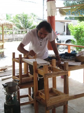 งานเขียนเทียน ตอนแรกรู้สึกว่าจะหาเฟรมที่ไหนนะ แต่พอเจอลูกค้าข้าวยำเป็นครูศิลปะ เขาแนะนำ โอ้ๆๆ ใชเก้าอี้ในร้านนี่แหละ โอ๊ยๆๆ ง่ายมากจริงๆ