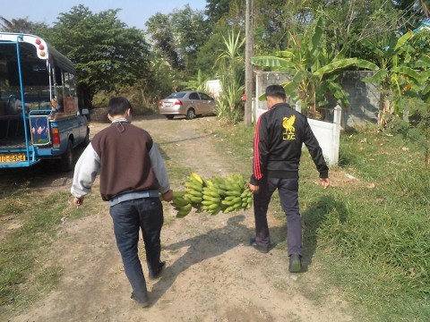 ให้เด็กมาช่วยตัดกล้วย น้ำว้าไส้เหลือง เอาไปแจกเพื่อนๆที่ทำงาน