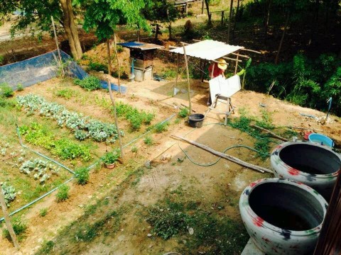 ผมเลี้ยงไก่แบบปล่อยครับ ส่วนแปลงผักล้อมตาข่ายกันไว้แล้ว