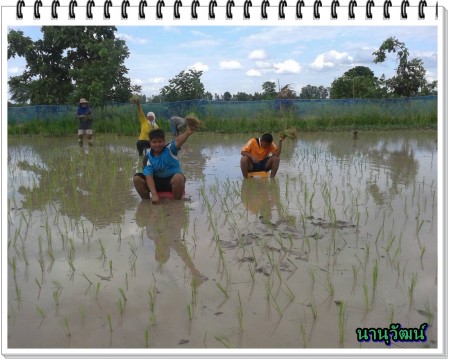 ทำนาปีนี้ปรับพื้นที่ วางระบบน้ำเรียบร้อย แต่ด้วยความที่ยังไม่ค่อยชำนาญงานกัน บวกกับเวลาที่มีอันน้อยนิด ตัดสินใจอีกครั้ง แบ่งแปลงนาแต่ละแปลงให้แต่ละคนรับผิดชอบ เบส ลุงนุ พี่จ๊อก พ่อ เบิร์ด ส่วนของเบิร์ดไม่ต้องเช่านาคนอื่นเหมือนปีที่แล้ว ให้ทำแต่ผลผลิตหารสอง+ช่วยกันทำ ส่วนโก๊ะมาช่วยช่วงวันหยุดเสาร์-อาทิตย์ แต่ก็ไม่ทุกอาทิตย์ หลังๆ มีฝึกงาน แลกกับที่ลุงนุให้ยืมตังค์ไปเรียน 6 เดือน ที่ในเมือง (เบิกได้เรื่อยๆ ไม่คิดดอก มีเมื่อไหร่ค่อยมาคืน) มีน้าใจ พี่บล(ภรรยาสุดที่รักของพี่จ๊อก) มาช่วยตลอดเหมือนกัน ส่วนตัวเราแทบไม่ได้ช่วยอะไร ส่งแรงใจ แรงเงินไปให้เท่านั้น หยุดงานคราวหน้าสัญญาจะไปช่วยแน่นอน (ภาพทำนาปีที่แล้วยังจำได้ เหนื่อยมาก แต่ก็สนุกดี) แบบฉบับ “นานุวัฒน์ ทำเกษตรให้สนุกและมีความสุข”