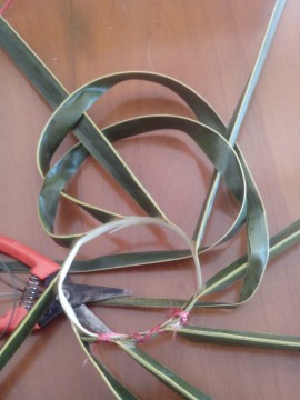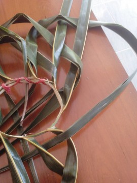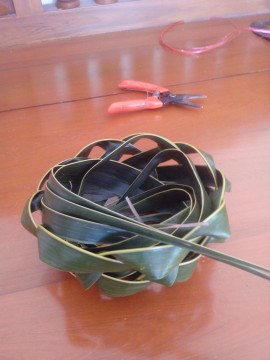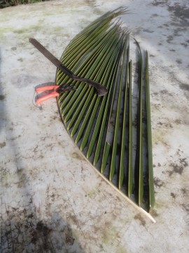 ทางมะพร้าวติดใบ เล็กใหญ่ สั้น – ยาว ตามขนาดที่ชอบ ว่าต้องการสานกระเช้าขนาดใด ได้มาแล้วฉีกครึ่ง