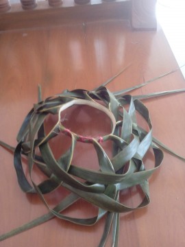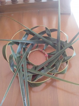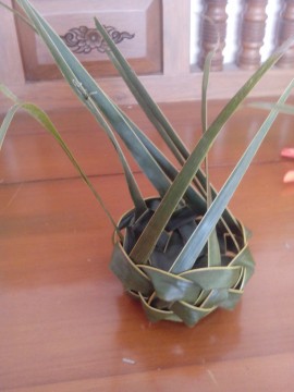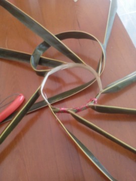 วาง วงใบมะพร้าว ที่เตรียมไว้ โดยเอาก้านใบ ขึ้นด้านบน อย่างที่เห็นนี่