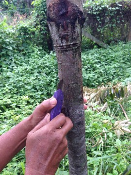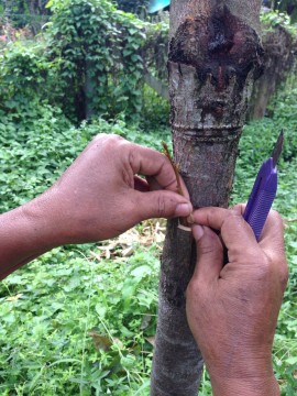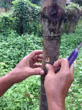 ที่โคนกิ่งใช้มีดปาดให้เป็นรูปลิ่ม แต่ไม่เท่ากัน คือ ด้านที่ ‘แนบลำต้น’ ปาดพอถึงเนื้อไม้ เป็นแผลยาวหน่อย … ส่วนด้านที่ ‘แนบกับเปลือก’ ปาดประมาณ ครึ่งเซนต์ ฯ ก็พอ