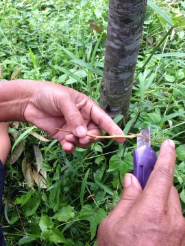 - นำกิ่งพันธุ์ออกมาเตรียม โดยตัดใบทิ้งให้หมด และตัดส่วนโคนกิ่งออก เหลือส่วนยอดไว้ตามต้องการ