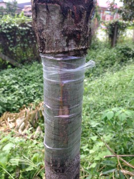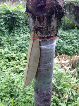 - พันเทปพลาสติก จากล่างขึ้นบน โดยเริ่มต้นพันให้ค่อนข้างแน่นหน่อย ... พอถึงบริเวณแผล ผ่อนแรงลงหน่อย เป็นการป้องกันตากิ่งช้ำ ... เลยแผลแล้วเพิ่มแรงดิงอีกครั้ง