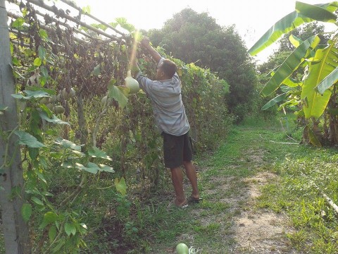 วันนี้อ้ายเวทย์มาสวนด้วย บอกจะเก็บผักไปฝากแม่ บ้านแม่อ้ายเวทย์ห่างจากบ้านแดง 2 กม. นาน ๆทีแม่อ้ายเวทย์แวะมาเที่ยวสวนที แต่ผักอ้ายเวทย์เก็บไปให้แม่ประจำ