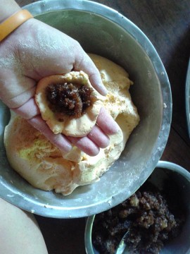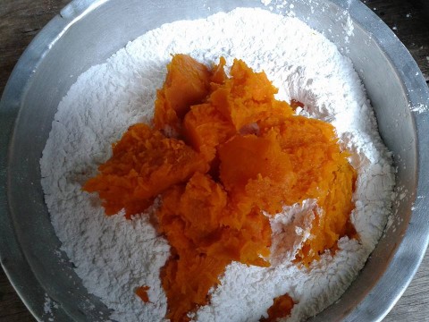 ฟักทองนึ่งสุกจนเละขูดเอาแต่เนื้อ นวดให้เข้ากัน ถ้าไม่มีฟักทองจะใช้เผือกใช้มันแทนก็ได้ การใช้ฟักทอง ใช้มันหรือเผือกผสมแบบนี้ จะทำให้แป้งมีสีสวย นึ่งสุกแล้วจะหอมและอร่อยกว่าการนวดแป้งอย่างเดียวมาก