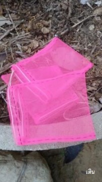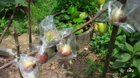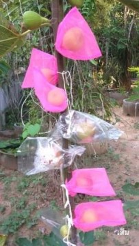 การห่อผลก็เริ่มเปลี่ยนมาใช้ถุงรูดที่ทำเองแบบง่ายๆ โดยน้องเก้เย็บจากเศษผ้าชมพูจากงานแต่ง