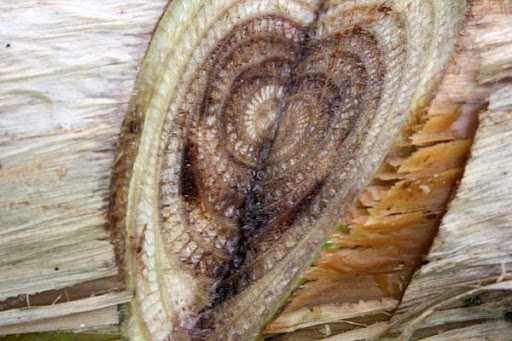 ช่วงนี้ดินจะอุ้มน้ำ ทำให้ ตัวสัตว์ต่างๆ ที่อยู่ใต้ดิน เคลื่อนที่ง่าย(มั้ง) ตอนนี้เจอ อาการนี้เลย 2 ต้น ต้นหนึ่ง กำลังจะออกปลี วัดรอบโคนได้ 34 นิ้ว ก็ต้องยอม ตัดทิ้ง อีกต้น ออกลูก ใกล้แก่ ก็เว้นไปก่อน แต่ก็ใจไม่ดีนะ กลัวโดนยกสวน เหมือนเจ้โส ตัดแล้วดูที่รอยตัด เป็นสีเหลืิองๆ ยังไม่ถึงขั้นในรูปนะ แต่ขุดดูในดินแล้ว เจอหนอน คล้ายด้วง ปากแข็งๆ สีน้ำตาลเข้ม ใครรู้เข้ามาช่วยกันหน่อย