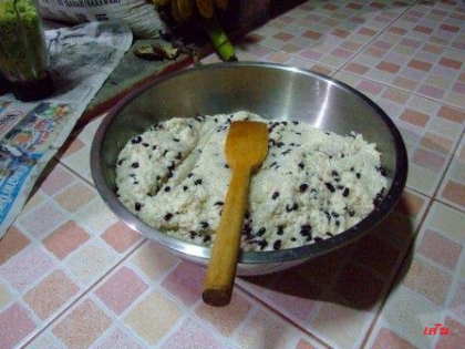 ใส่ถั่วดำผัดเข้าไปจนข้าวเหนียวไม่ติดพาย