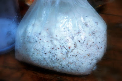 จากรูปที่ผมได้เปิดปากถุงระบายอากาศออกไปบ้างแล้ว ยังสังเกตุได้ว่ามีฟองอากาศอยู่ และมีตะกอนนอนก้นน้อยมาก (ปรกติเมื่อมีขบวนการหมัก เช่นไวน์หรือน้ำส้มสายชู จะมีตะกอนโปรตีนนอนก้น ผมเรียกว่าซากศพของจุลชีพ) แสดงว่าเอนไซม์หรือจุลชีพต่างๆทำงานได้ไม่เต็มที่ เนื่องจากสภาพแวดล้อมไม่เหมาะสม (อุณหภูมิ)