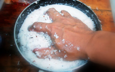 จากนั้น นำมาผสมด้วยน้ำอุ่น (ทดลองตามคำแนะนำของลุงพูน) ปริมาตรครึ่งลิตร ในภาชนะที่ล้างด้วยน้ำก๊อกธรรมดา