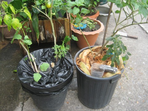 ๕ รดน้ำ หมักเจือจาง หรือน้ำ ลงทางขวดน้ำ ที่ตัดปลายลงถัง จนสังเกตุน้ำล้นจากรูที่เจาะไว้ ก็หยุดเติม ๑ครั้ง/สัปดาห์